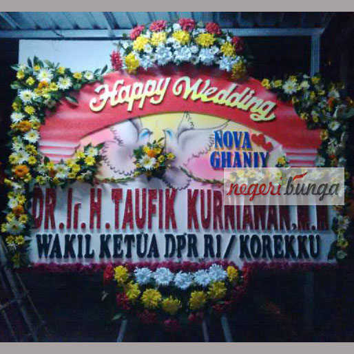 Bunga yang dirangkai yaitu krisan, aster, garbera, jimla dan bunga lainnya. Kami menggunakan bunga baru (fresh) dengan warna disesuaikan moment.